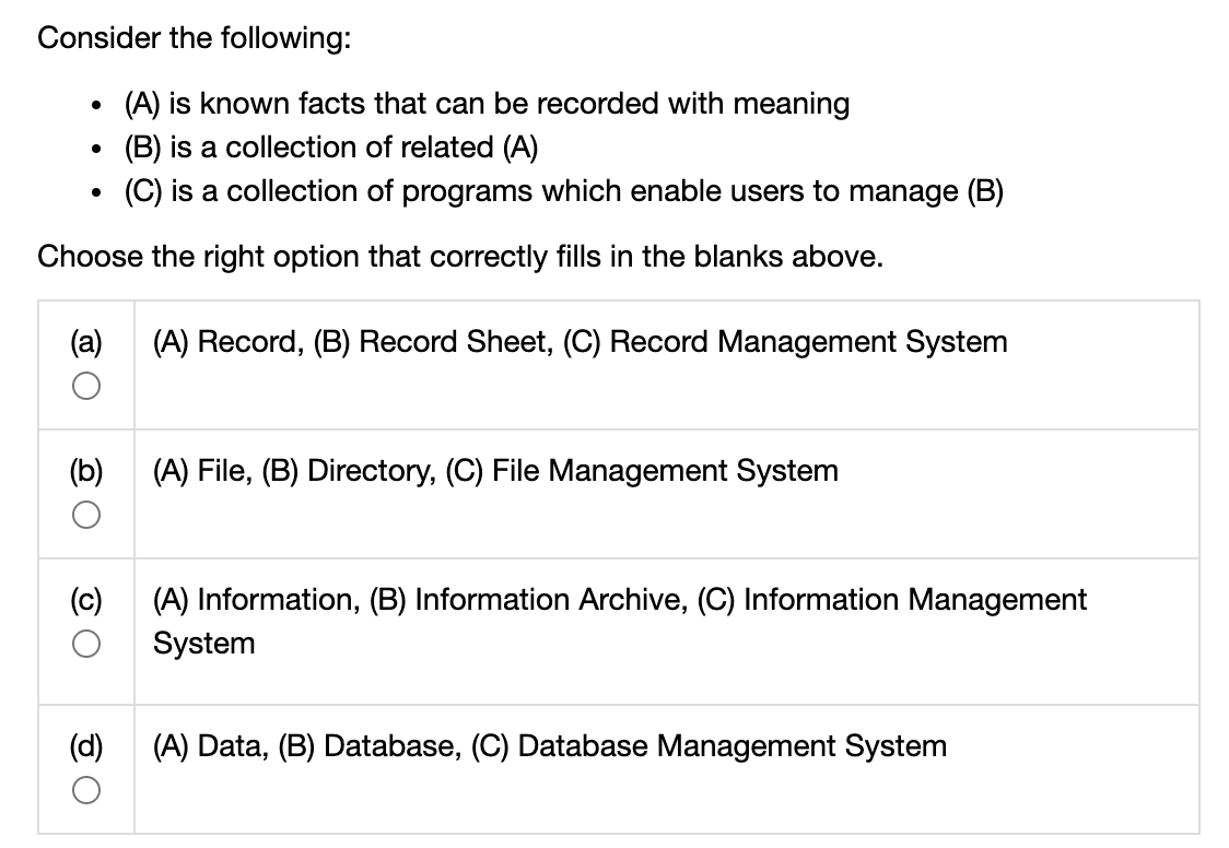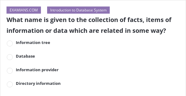 What name is given to the collection of facts items of What name is given to the collection of facts, items of information or data which are related in some way? A. Database. B. Directory information. C. Information tree. D. Information provider. E. None of the above. Answer: Option A